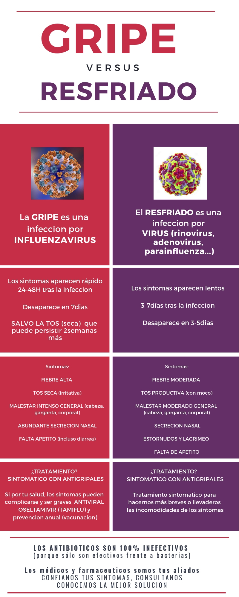 Destacar que comparten una cualidad: su naturaleza vírica, y por tanto, LOS ANTIBIÓTICOS NO SON EFICACES PARA TRATAR GRIPE O RESFRIADOS. Si os lo receta el médico es porque algo se ha complicado un poco y entonces también hay infección bacteriana [generalmente en mucosidad presente en pecho, oídos, garganta o nariz].