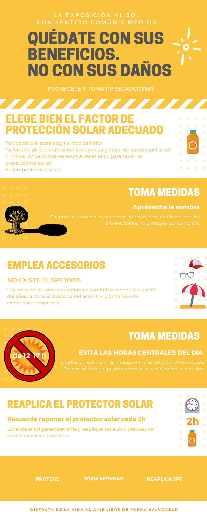 - Evitar la exposición solar en las horas centrales del dia (12-17h) en las que la radiación solar es más intensa.